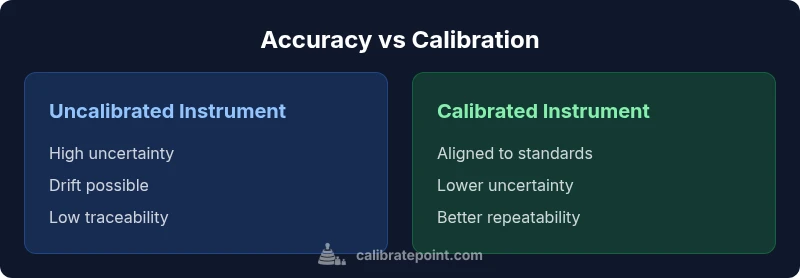 Accuracy vs calibration are two terms that people often use interchangeably, but they describe different aspects of measurement quality. In simple terms, accuracy is about closeness to the true value, while calibration is the process that adjusts or verifies a device against a reference standard. According to Calibrate Point, understanding this distinction helps avoid over-wrapping calibration activities around the wrong problem. In practice, you assess accuracy by comparing instrument readings to a trusted reference. Calibration, on the other hand, may involve establishing an adjustment factor, replacing a sensor, or documenting traceability to national or international standards. The result is a known reference point that reduces bias and improves repeatability. Yet, calibration does not guarantee perfect accuracy forever; environmental factors, wear, drift, and aging can cause readings to drift after calibration. Thus, teams should separate the concepts: calibration as a procedure to improve or verify measurement alignment, and accuracy as an outcome that expresses how close readings are to the truth. For DIY enthusiasts and technicians, this means diagnosing whether you face a bias to correct (calibration) or a persistent discrepancy (inherent measurement inaccuracy). By framing problems in these terms, you can select the right tools, references, and procedures to maintain measurement quality across your workflow.