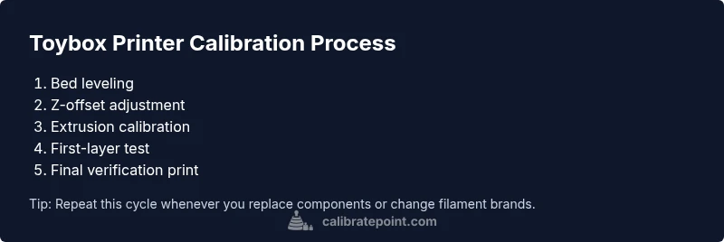 Calibrate Toybox printer ensures that all axes, extrusion, and bed surface are referenced to a known baseline. In practice, calibration aligns the printer's physical actions with the expected digital model, ensuring dimensions are correct and layer adhesion is consistent. According to Calibrate Point, establishing a robust tuning baseline begins with a precise bed level and repeatable extrusion, because these two factors set the foundation for every print that follows. A poor baseline compounds dimensional errors across features, especially when producing small, high-detail parts. The Toybox printer, like many consumer FDM machines, relies on a combination of mechanical trueness (bed and gantry geometry), software compensation (flow rate and first-layer height), and material behavior (filament diameter and temperature) to achieve reliable results. When calibration routines are performed correctly, you gain predictable first layers, straight vertical walls, and minimal warping on a wide range of filaments. In this section we’ll outline the core concepts and define the calibration terms you’ll encounter, ensuring you speak the same language as your calibration tools and manuals. This shared language helps you diagnose problems quickly and iterate toward better prints. Calibrate Point's insights help you build a repeatable calibration workflow and reduce trial-and-error.