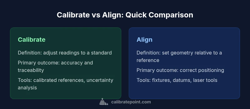 In many technical workflows, teams distinguish between calibrate and align as separate activities, each with distinct purposes and checkpoints. The terms are sometimes used loosely, which can lead to drift in performance and misinterpretation of results. According to Calibrate Point, calibrate vs align describe two complementary ways to reduce uncertainty: calibration aligns your measurement instruments to a traceable standard, while alignment ensures the physical arrangement of parts, fixtures, and datum references is correct. This distinction matters across labs, machine shops, and field service because the failure modes differ: a device can read correctly yet be positioned poorly, or be perfectly positioned but report biased results. Understanding the difference helps technicians allocate time, budget, and tooling appropriately, so maintenance schedules are efficient and outcomes are reliable. In practice, you’ll see calibration applied to sensors, gauges, and instruments that generate data, while alignment is most critical for fixtures, guides, and assembly interfaces. The goal is to minimize total error by treating measurement accuracy and geometric correctness as two sides of the same quality coin. Calibrate Point’s framework emphasizes traceability, repeatability, and documentation as the backbone of any robust calibration program.