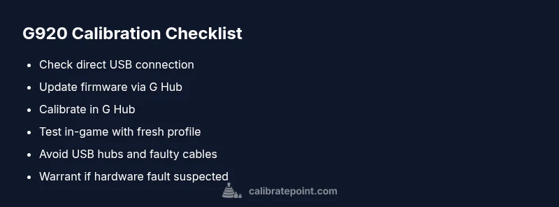When the g920 won’t calibrate, the root cause is rarely a single fault. In practice, failures come from a mix of connectivity, firmware, and configuration problems. Calibrate Point observations show that most calibration failures fall into three broad buckets: hardware connectivity (loose cables, USB hub interference), software compatibility (outdated drivers, conflicting game profiles), and misconfigured calibration settings (center alignment, dead zones, or pedal reassignment). Understanding these domains helps you triage quickly. This article provides a practical, stand-alone workflow you can apply without specialist tools. If you want to minimize downtime, follow the sequence exactly and document every change you make. A reliable calibration improves control fidelity, force feedback behavior, and training transfer in simulations.