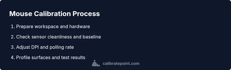 A structured workflow helps ensure nothing is skipped. Begin by verifying the physical sensor window is clean and free of debris, then check the baseline movement by performing a quick cursor sweep. Next, adjust DPI and polling rate using the mouse’s software or the operating system control panel, and test across common tasks. After that, profile each surface you use most, performing a short calibration pass for each one. Finally, run a practical test with real tasks (drag-and-drop, fine reticles, and web browsing) to confirm stability. Keep notes of your settings and the results of each test so you can refine later. Calibrate Point emphasizes repeating the tests on multiple sessions to verify reliability across time.