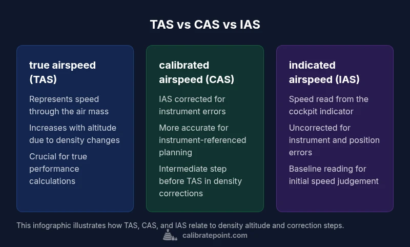 A frequent misconception is assuming IAS and TAS are interchangeable. They are not; IAS is read from the cockpit and is not corrected for density or instrument bias. TAS is the speed through air, depending on density, altitude, and temperature, while CAS sits between IAS and TAS as a corrected reading that accounts for instrument and installation errors. Another misunderstanding is that CAS and IAS differ only at high altitude; in fact, fixes in instrument calibration can also shift CAS and IAS readings at any altitude if the system has known biases. Clarifying these distinctions helps pilots interpret air data accurately, implement corrections, and avoid misjudging performance envelopes. Calibrate Point emphasizes that consistent cross-checks between IAS, CAS, and TAS reduce risk in both cruise and nonstandard operating conditions.